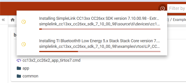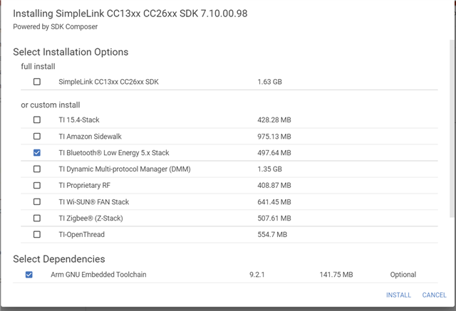 比如我选择了 BLE5-Stack 下的 basic_ble。进入其文件夹中,TI-RTOS7 -> TI Clang Compiler -> basic_ble。此处,我们就得到了相关示例的CCS文件。此时右上角会跳出一个 import 按钮,如下图: ,点击install,然后不需要完整安装,选择custom install选择需要的部分,比如蓝牙低功耗的部分,如图: ,然后点击install,就会看到在下载了:
