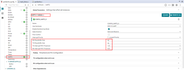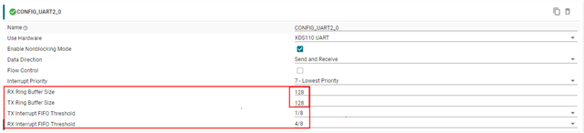 如果您打算使用特定值,请在 Display/UART2 UART 之间共享该值;因此,在本例中,由于数据大小 128 大于 32,因此也将 UART2 设置为 128。