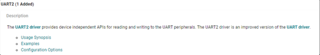 对于配置选项,展开“?” 位于 UART2 旁边(已添加 1 个),它将为您提供有关使用 UART2 驱动程序 API 的有用信息。