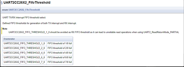 • 为了使 UART 生成中断,您需要考虑 UART 当前处于什么模式(例如非阻塞或阻塞)以及 TX/RX 中断 FIFO 阈值设置为什么值。有关 TI 驱动程序 API 的一些有用信息,请参阅UARTCC26XX.h 文件参考,该文件提供了有关函数、FIFO 和用例的一般行为的一些有用的见解。