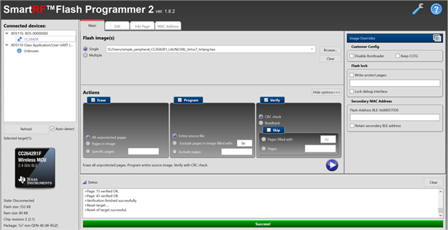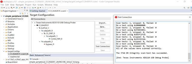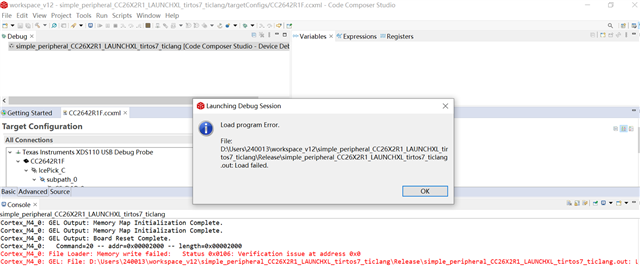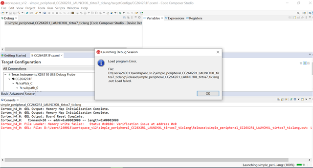 用TI原厂的XDS110 DEBUG PROBE , 可以用SmartRF 刷写CC2642的程序,并且在CCS V12 IDE的Test Connection也显示ok, 但是用CCS V12 IDE的Debug或load下载调试软件就不行,请问有什么解决方案?