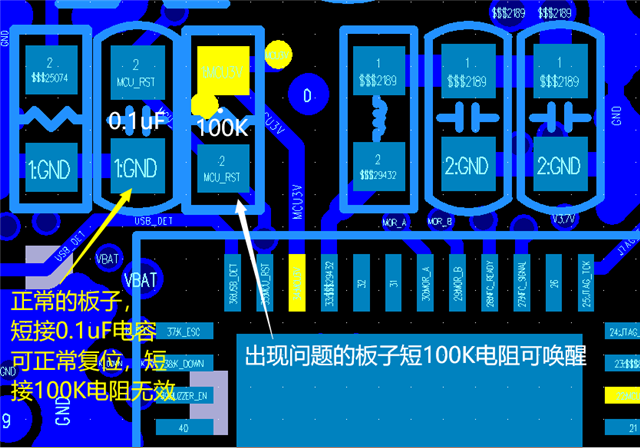 通过筛查我们发现生产阶段中OK的板子,在器件RESET引脚上加低电平是可以正常复位,加高电平则无变化;