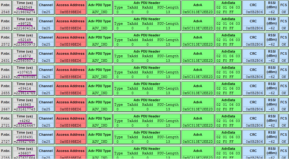 对于第1个问题,我发现有多个蓝牙设备一起广播的时候,原本设定2秒一次广播的设备,广播时间间隔就不稳定了,有时几毫秒有时几百毫秒。可能是其他蓝牙设备对该设备的干扰。