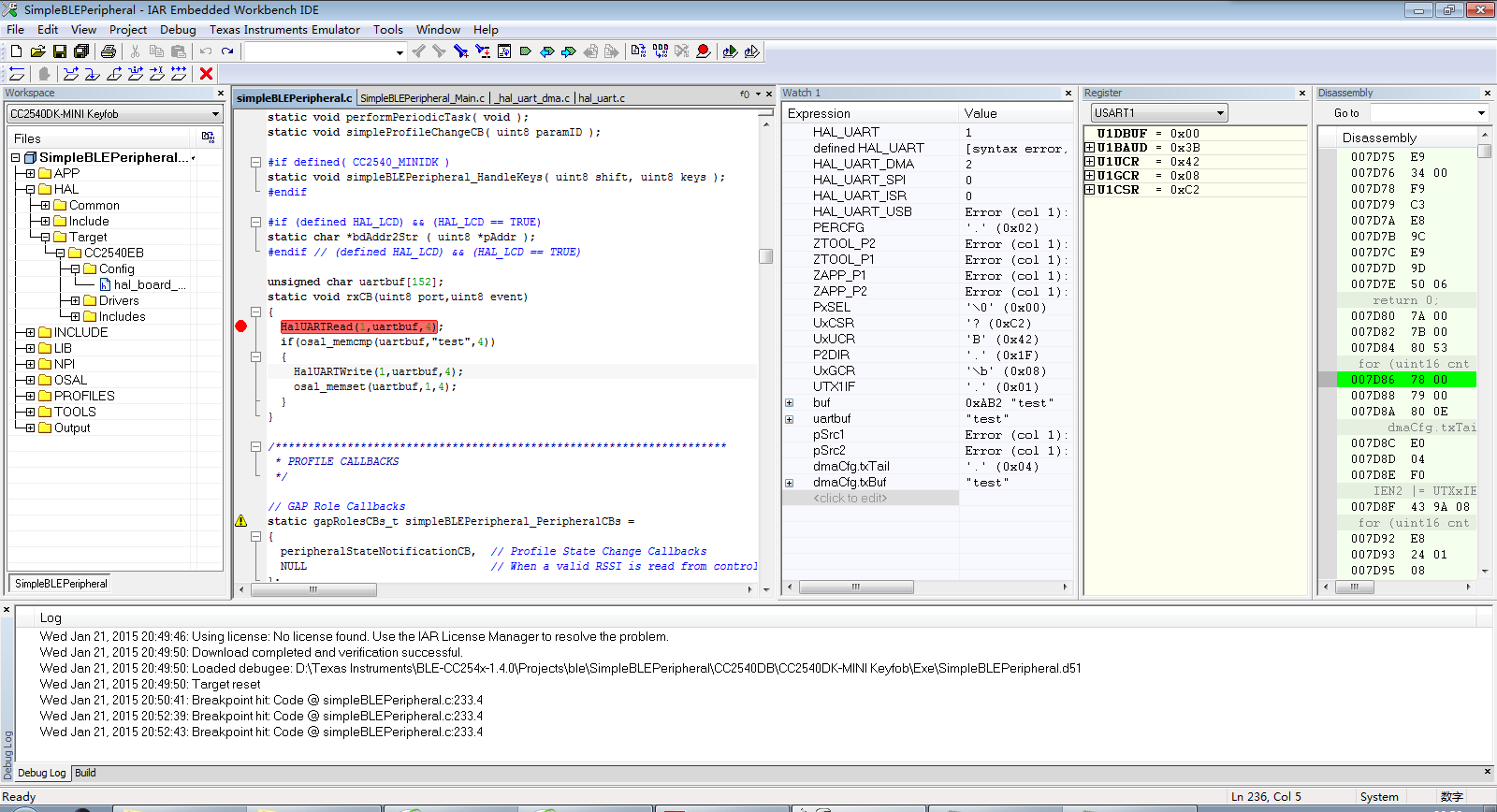 基于CC2540在SimpleBLEPeripheral工程的基础上进行串口收发实验:HalUARTRead函数读取,再用HalUARTWrite函数发送。读取可以但是发送失败了,请问是什么原因?