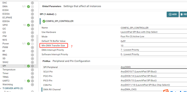 请问下 LAUNCHXL-CC26X2R1 ,SDK 7_10_01_24, 如何使用SPI DMA模式,是否有示例程序,如果没有示例的话,应该如何使用SPI的DMA的模式呢?谢谢