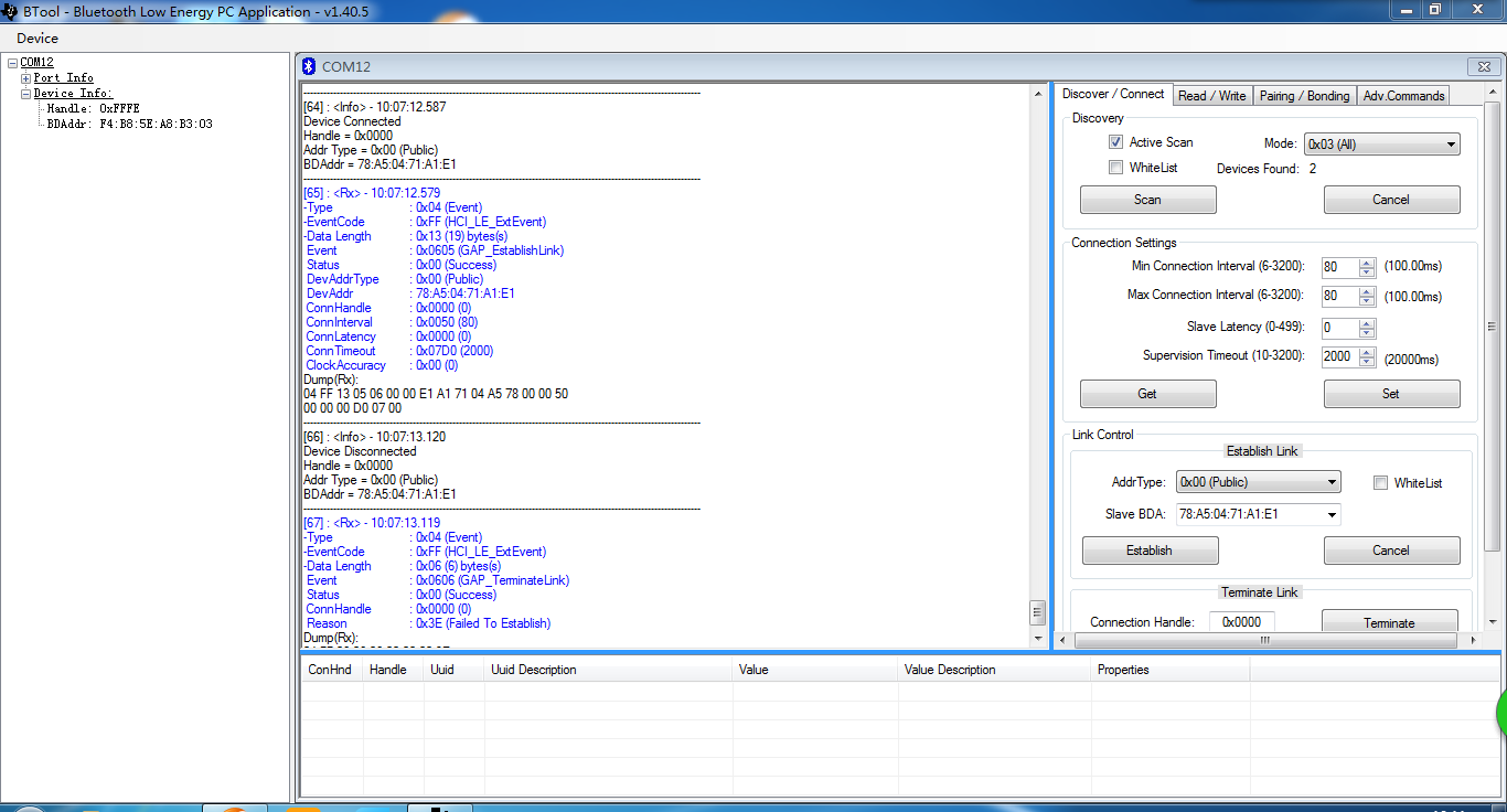 USB_Dongle(烧录HostTestRealse)插上电脑在BTool里面打开,去连接从机(烧录SimpleBLEPeripheral),但是连接上后立刻断开(如下图)。请问可能是什么原因导致的?是USB_Dongle代码的问题吗?