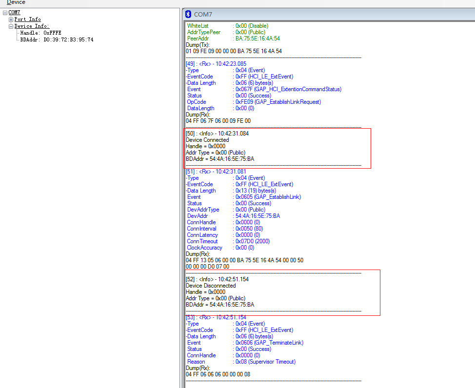 但是过一段时间之后,就会出现图中第二个红色框,自动的断开了连接。这个时间是20s。蓝牙设备代码使用的是1.4.0里面的simpleBLEPerphrial工程。