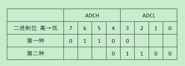 2、还有一个问题,如果精度选择9位的话,那么ADC转换完成后,查询转换结果寄存器ADCH和ADCL,这两个寄存器一共有16位bit,转换结果9位bit在两个寄存器中是怎么放的?