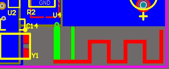 我的板子的天线端是按照TI的USB Dongle Reference Design来做的,天线尺寸、形状都没什么问题。