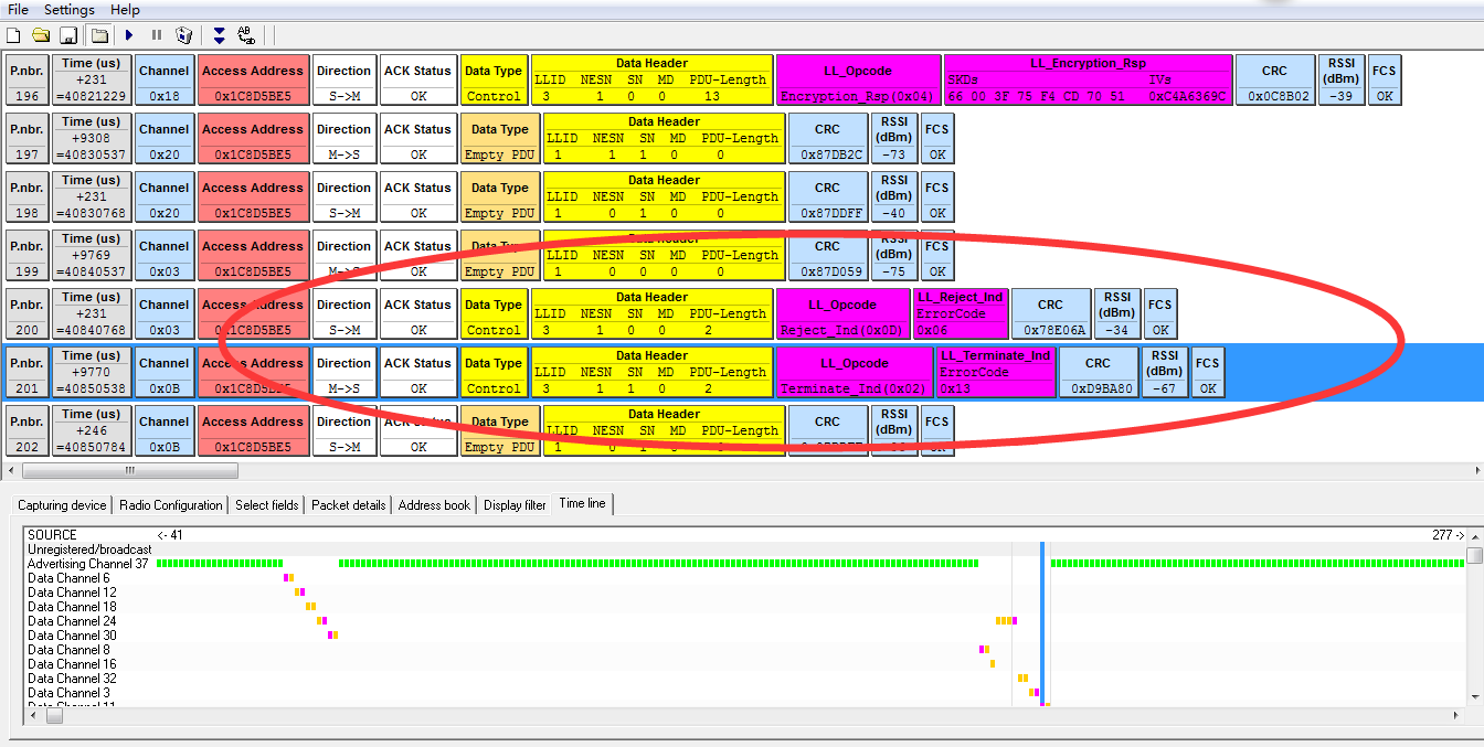 看图中,是由Slaver执行了reject_Ind,原因是0x06(PIN OR KEY MISSING),然后Master执行Terminate_Ind,所以在XP的搜索界面上一直无法看到烧录了simplePeripheral工程的设备。