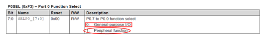 我是个菜鸟,刚接触到CC2541芯片,我想问一下在P0SEL中,设置成General-purpose I/O和Peripheral function有什么区别?