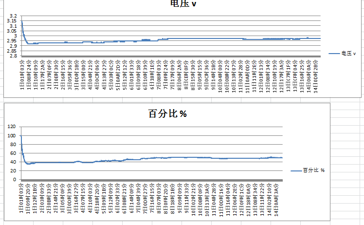 供电用的CR1620,测试后发现,电池电压有降低在升高的状态,电池百分比也有同样现象,不知道是什么原因造成这种现象。请看附件波形图