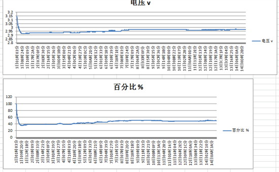 • 第一幅图片是用万用表实时测量电池两端的电压,然后做成的折线图,而第二幅图是ADC的采集电量数据发送到PC上的数据,两者差异不大,但是电压升高的这种现象应该不是ADC的问题吧,毕竟我用万用表实时测量电池两端的电压啊。不解!求解答。