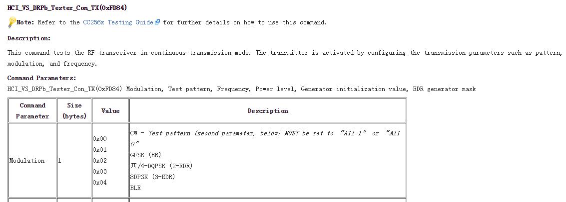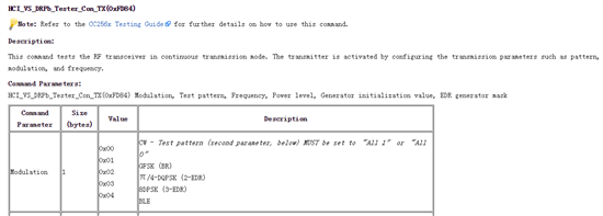 韩国的认证需要EUT发射非调制波(载波),我看了HCI commands,发现线命令HCI_VS_DRPb_Tester_Con_TX(0xFD84) 可以控制芯片发射连续波出来,但是非调制波是0x00: CW吗?
