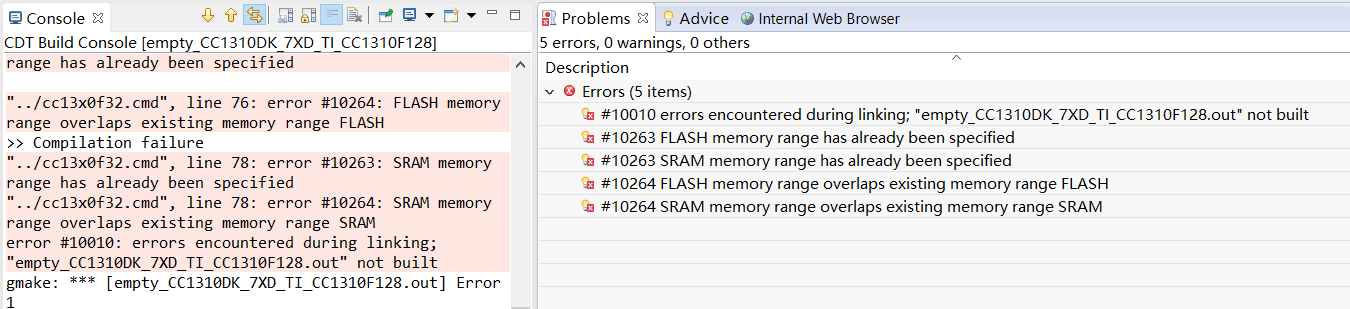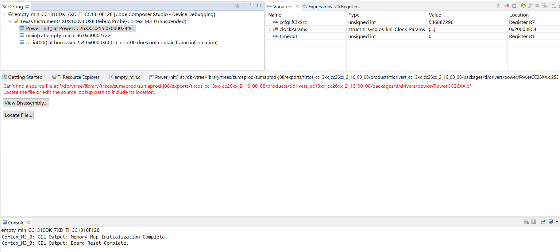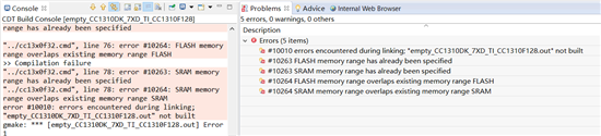 3、从工程中删除CC1310DK_7XD.cmd文件(猜测可能和工程设置里面的CC1310F32.cmd冲突)编译通过,但debug时发现大量文件未添加导致寸步难行