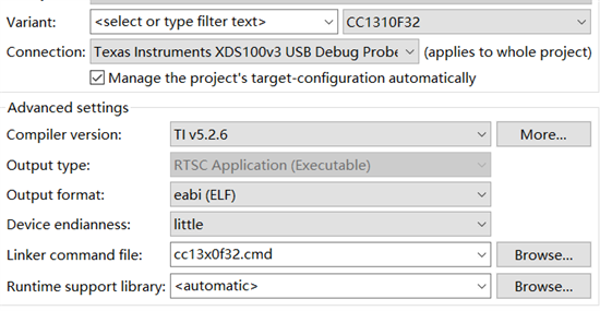 2、在工程设置里面把器件改为CC1310F32,编译报错