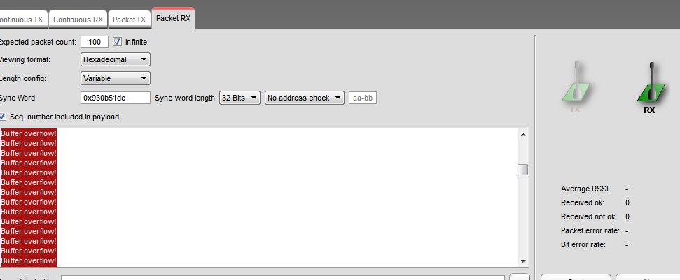 2. CC1310收,另一款RF来发射,由于这款RF的前导码与cc1310不同,于是我将发送包模拟为CC1310的帧格式,即实际发送的为“另一款RF的特定帧头+ cc1310 的(前导码+同步字) + 数据内容” 理论上CC1310能够接收发送帧然后剥离前导码同步字获得数据内容, 但是实际却是半天收不到,过了一会儿smartRF Studio接收窗口出现"Buffer over flow!" 这是咋回事???
