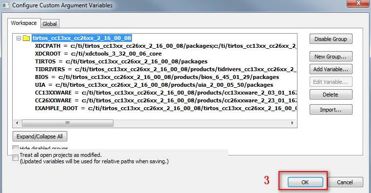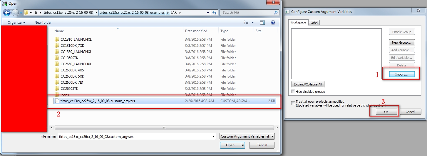 8)导入TI RTOS相关的环境变量,环境变量是tirtos_cc13xx_cc26xx_2_16_00_08.custom_argvars,位于C:\ti\tirtos_cc13xx_cc26xx_2_16_00_08\tirtos_cc13xx_cc26xx_2_16_00_08_examples\IAR路径下面