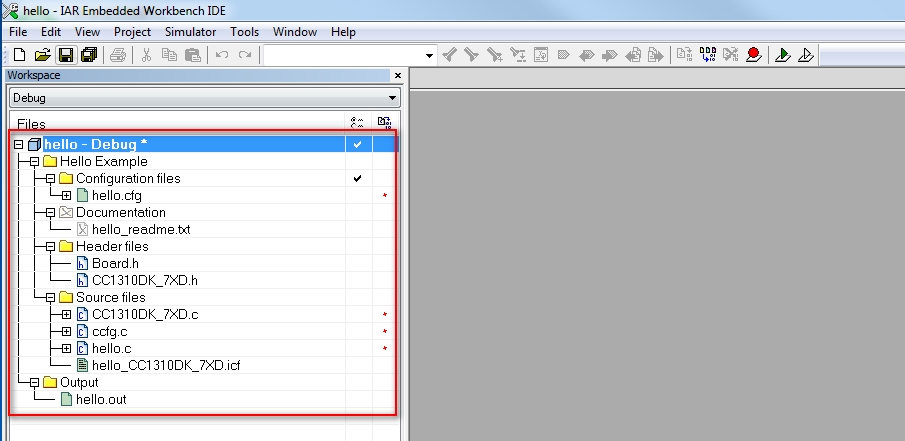 下面以创建C:\ti\tirtos_cc13xx_cc26xx_2_16_00_08\tirtos_cc13xx_cc26xx_2_16_00_08_examples\IAR\CC1310DK_7XD\hello下面的hello工程为例做演示