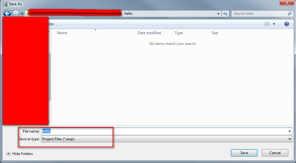 4)保存Project到拷贝过来的hello文件夹,并且工程名为hello,后缀是ewp格式。
