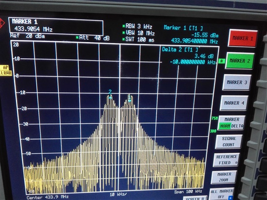 CC1100进去空载连续发送,频谱仪测试输出频率偏差大约10KHZ的样子,带数据发送也一样,不知道什么问题