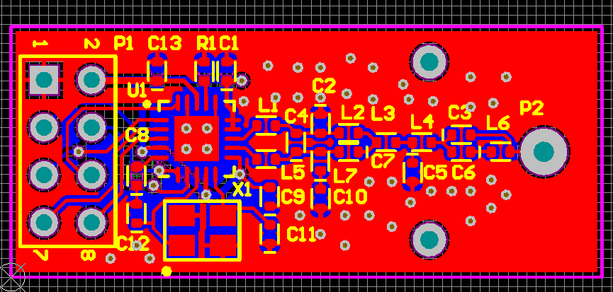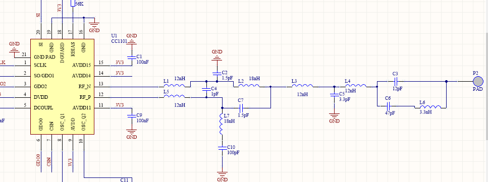 根据ti官网datasheet上的原理图画的915MHZ的RF模块,测试的时候发现发射频率只有880MHZ。后期调试怎么调整RF发射频率到915MHZ,原理图与pcb如下。
