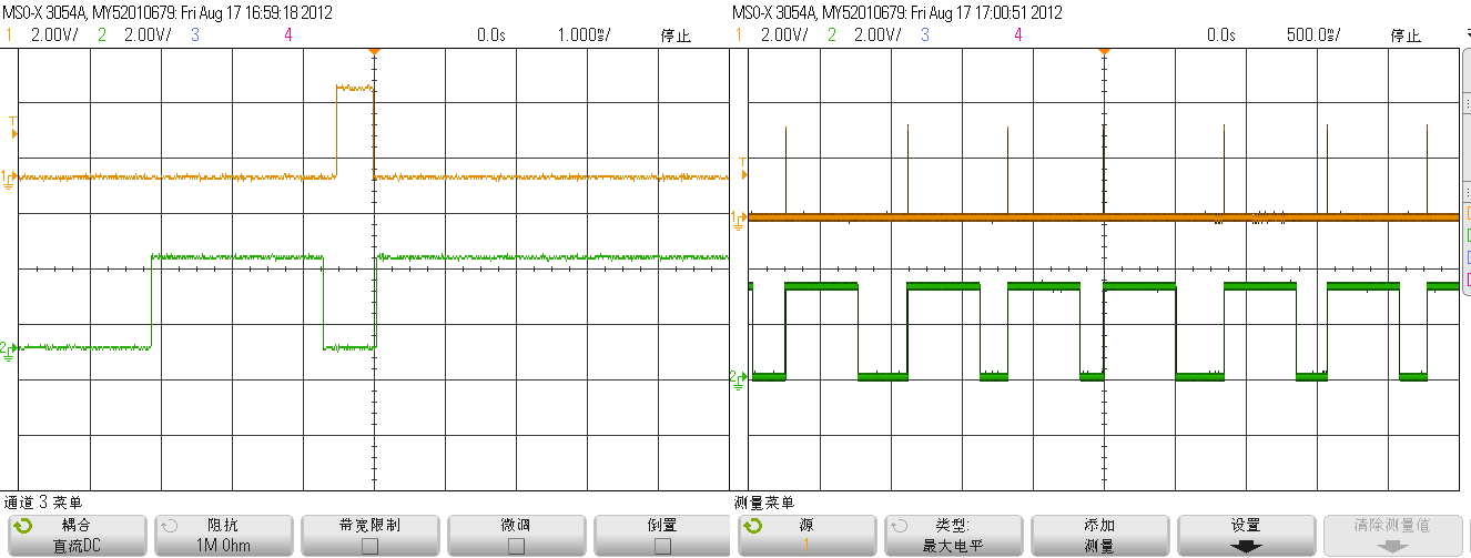 现在路由连不上协调器(协调器好用,其他设备可以连上),怀疑是这边寄存器控制的问题,同时附上两幅P1_1(一通道信号)和P1_2(2通道信号)的输出信号波形,还请哪位专家帮小弟看看,不胜感激!