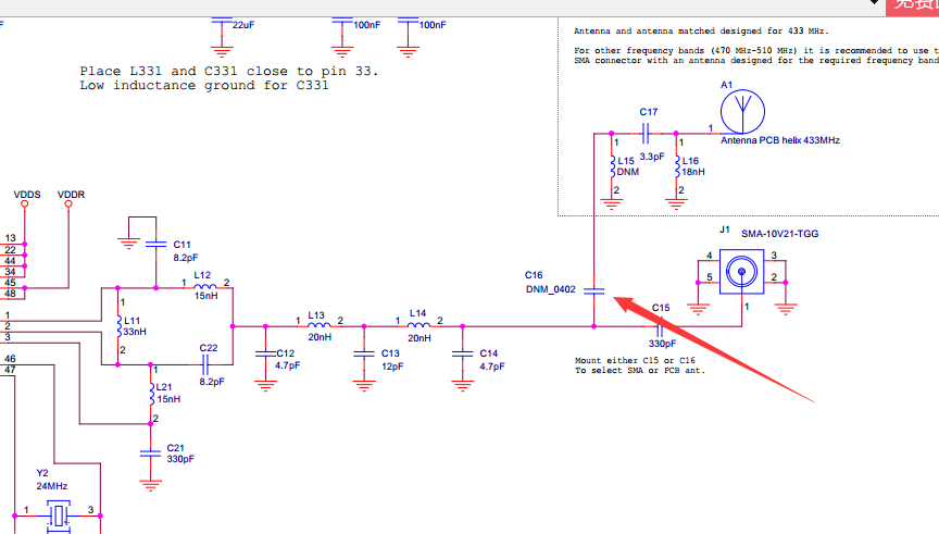 我想使用433MHzde 板载天线,但是不知道选择使用多大的电容,也是使用330PF的电容吗?