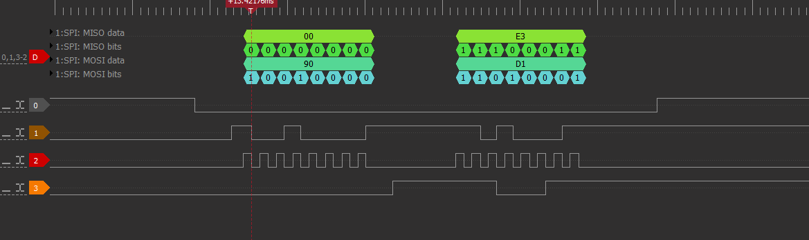 请问下这个CC1200的SPI驱动时序有问题吗,为什么每次读寄存器的值返回的都不一样呢,SPI速率是2.5M左右,0是CS,1是MOSI,2是CLK,3是MISO