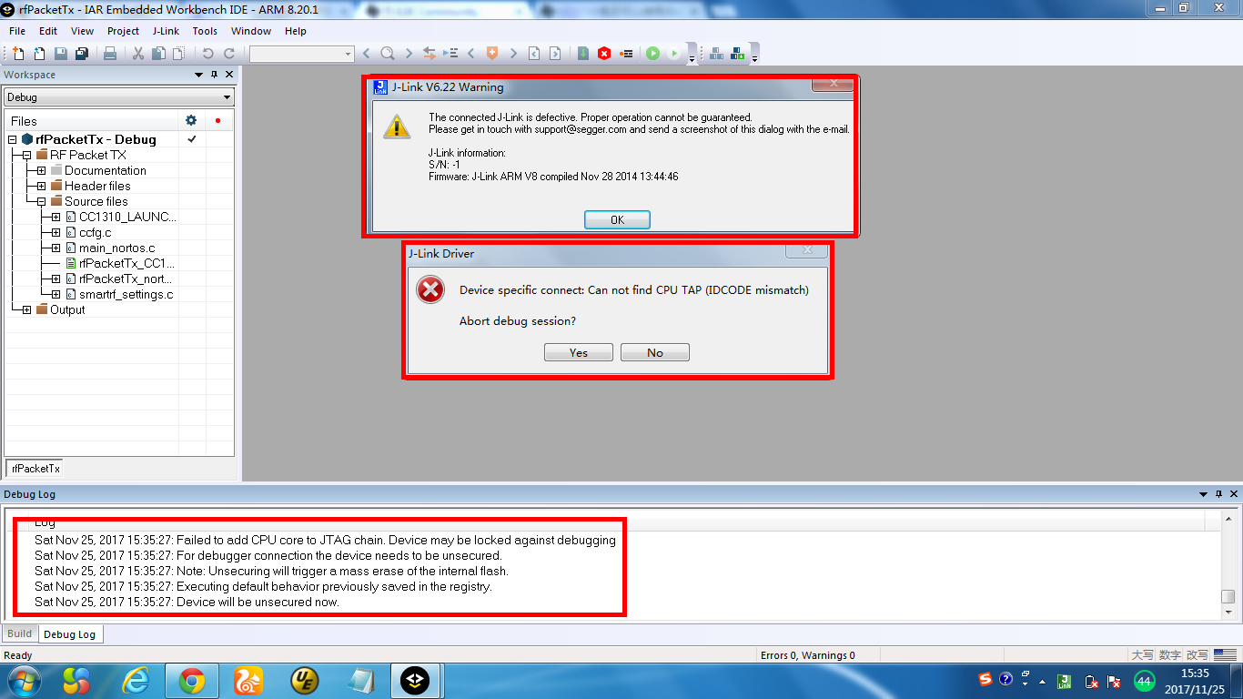 显示Cannot find CPU TAP(IDCODE Mismatch),下方的输出栏也显示JLINK无法连接到CPU内核