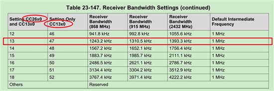 对于.rxBw的设置,按照Technical Reference Manual中的Table 23-147. Receiver Bandwidth Settings,使用CC26xx对应的设定值