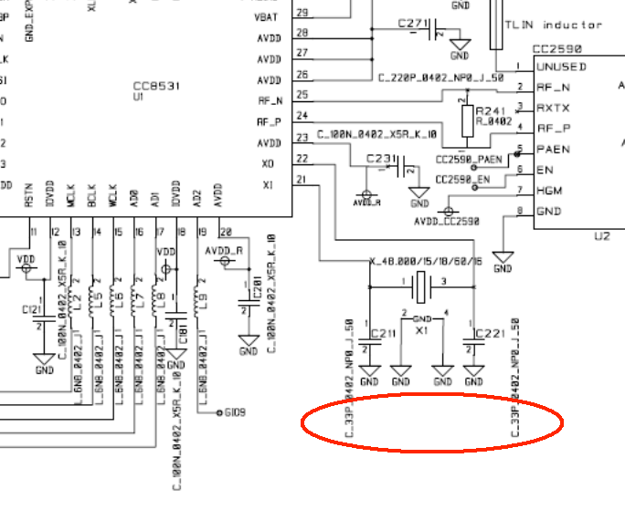 CC85XXdatasheet上面是写的16pF,为什么demo板CC85XXDK-HEADSET User’s Guide原理图上用的是33pF,难道这是随便可以改的吗原谅我的无知,如下图