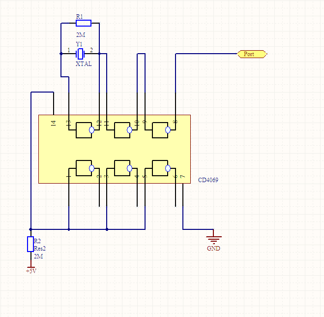 2、资料上说CD4069不用的输入端要接到正或者地,但是图中为什么要接R2再到Vcc