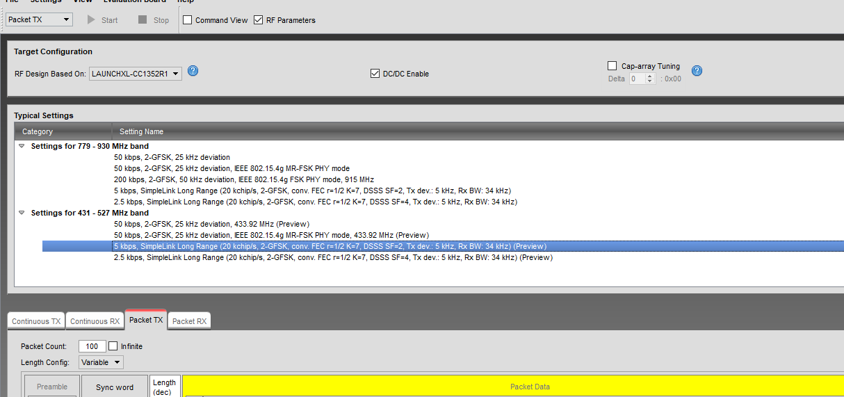 CC1352R 具体传输距离没有测试过,我们提供远距离传输配置参数如下;