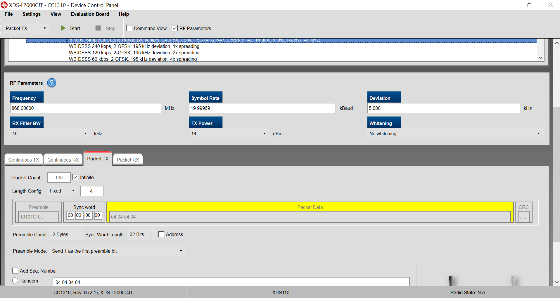 我现在用smartrf studio做测试,选择 5kbps, SimpleLink Long Range (...),