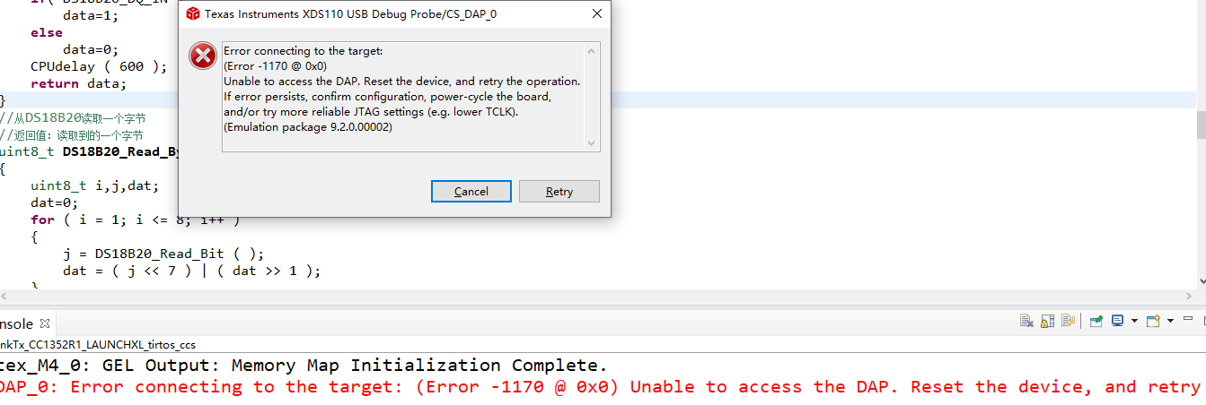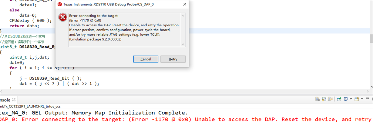对比测试发现,XDS110仿真器上不连接RST,则出现这情况,插针链接上RST则可以正常debug。