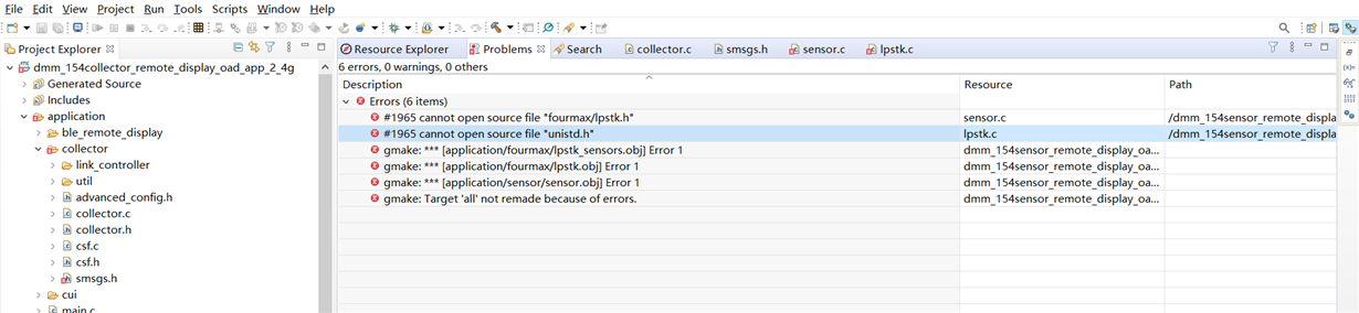 #1965 cannot open source file "unistd.h" lpstk.c /dmm_154sensor_remote_display_oad_app_2_4g/application/fourmax line 11 C/C++ Problem