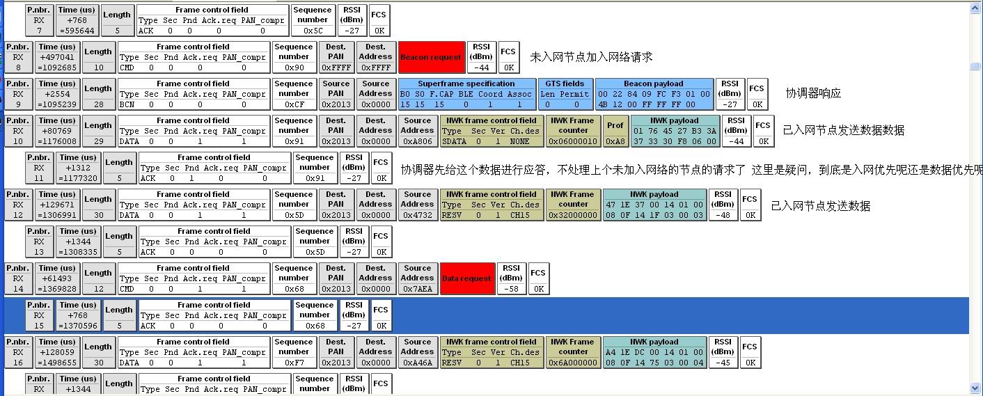 问题2:我现在只做了6个终端节点做测试,终端在入网后发送数据还是很正常的,但是当我把协调器重启后(我的协调器是带NV的),就会出现有的终端无法入网,或者入网速度很慢的现象。我只是对协议栈的入网的次数进行了修改,因为我测试的时候发现只要终端找不到网络后就会不停的去寻找网络,我设置终端只寻找一次网络,当找不到后我就设置个定时事件,每个5秒进行一次寻网。附件中是我的终端在寻网失败的抓包数据。