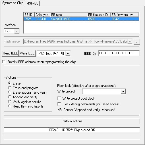 CC2511通过SmartRF05EB(v1.7)连接,被识别为CC2431。SmartRF(V1.7)的固件版本为0042。
