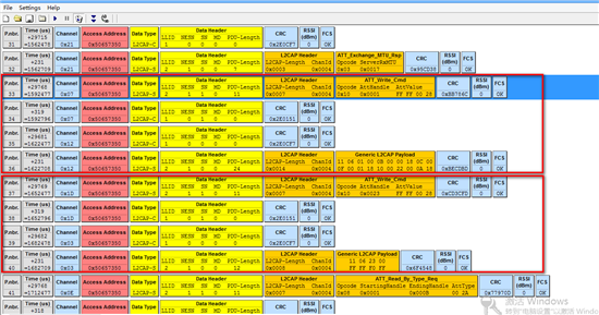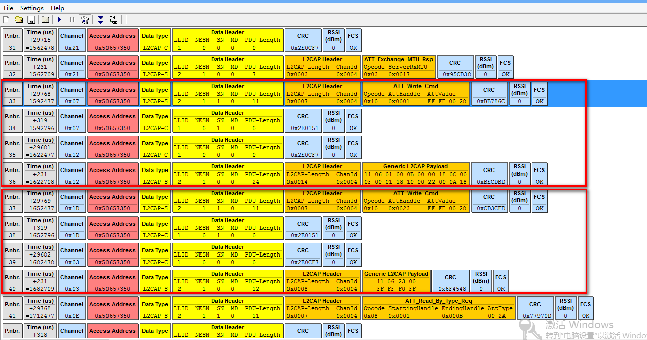 这是两个写的操作, 一个往0x0001的handle上写了FF FF 00 28, 另一个也是, 区别是写到了0x0023的handle上.
