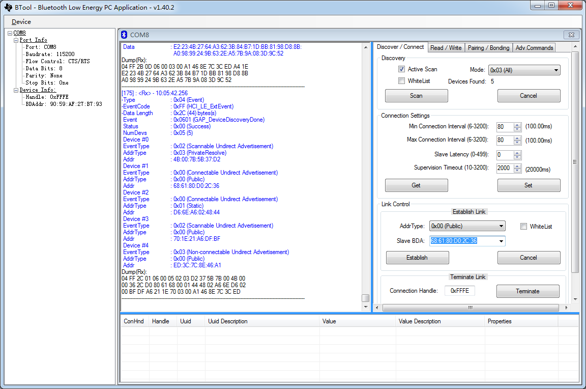2 BTool与USB Dongle可以扫出来5个蓝牙设备,但是其中的slave BDA中没有一个是我的keyfob.