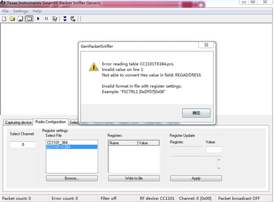 使用smartRF设置CC1101的配置,然后将配置导出,保存为prs文件,将prs文件导入sniffer中时,出现如下的错误,不知道出现错误的原因。