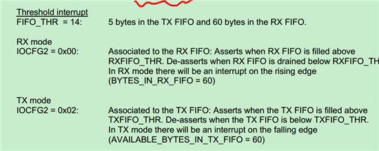 各位前辈及大牛们,小弟在在STM32上实现CC1100E大于64字节的数据传输,驱动代码主要借鉴TI提供的官方基于51的代码,现在已移植完成,RXFIFO和TXFIFO的阈值设置为5和60;不过现在遇到一个问题,我发送110字节数据,接收端接收的数据只有前面66BYTE是正确的,但后面的都是乱码,单步调试,发送端GDO2的阈值中断都能产生,接收端的GDO2阈值中断也能产生,已经在这个问题上困扰好几天了,还请各位指教,非常感谢!