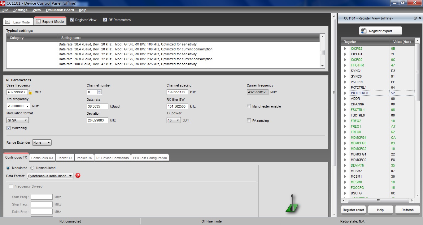 base frequency=432.9999817mhz,data rate=38.3835kbaud,其他参数均根据smart rf生成,因为smart rf中的cc1101里expert mode没有433选择,所以使用了generic 868Mhz的参数,在generic 868Mhz里选择38.4,Optimized for sensitivity,然后base frequency改成432.9999817,Tx Power改成10,其他不改。