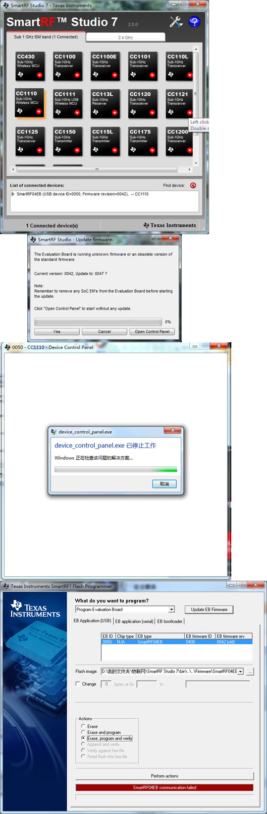 另外连接硬件后smartRF提示开发板固件版本需要升级。在取下开发板上的CC1110单片机以后选择升级固件时提示SmartRF04EB communication failed。