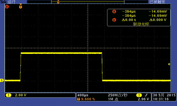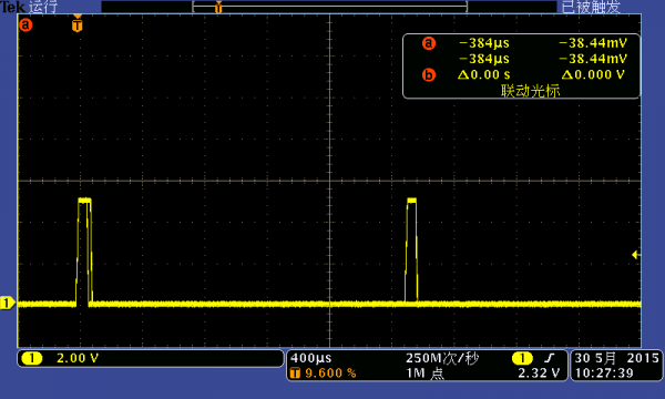 图片是发送数据0xFF 接收机收到的数据波形 ,两个脉冲中间的是数据,如果发送0x00时数据全是高的。