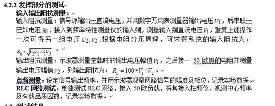 输入阻抗测量:信号源输出一直流电压,并用数字万用表测量器输出电压,后串联一已知电阻,接入到频率特性测量仪的输入端,测量输入端直流电压,重复上述操作一次可得另一组电压,根据电阻分压原理,可求得系统的输入阻抗为: 。