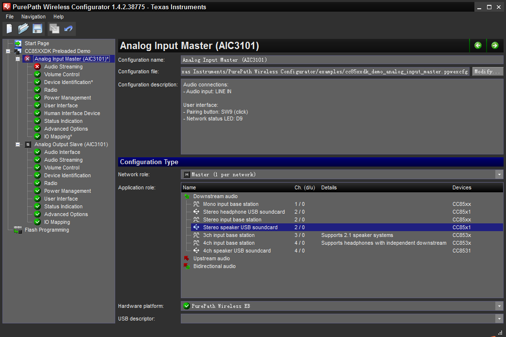 想用买来的cc8531DK实现usb声卡的功能,能实现吗?用purepath wireless configurator 配置总是出错。