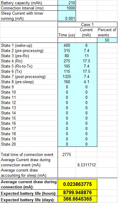 看你Connection interval设的多少,以CR2032纽扣电池为例,连接间隔1秒,可以用超过1年