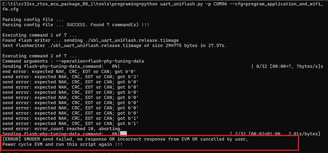After following this document:CC33XX MCU User's Guide , the WiFi application did not start and remained stuck on "Image loading done, switching to application ..." interface.What is the reason for this?